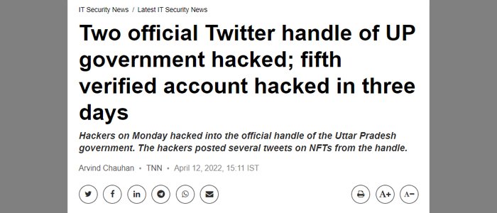 Kanishk Gaur was quoted in the news on two official twitter handles of the Government of Uttar Pradesh being hacked.