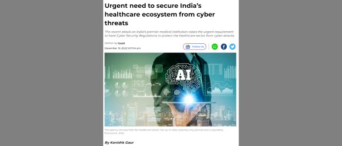 Kanishk Gaur, Founder, India Future Foundation, shared his views in ETGovernment.com and explained the “Urgent need to secure India’s healthcare ecosystem from cyber threats.”
